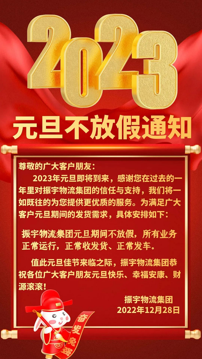 2023年元旦即將到來,感謝您在過去的一年里對振宇物流集團的信任與支持,我們將一如既往的為您提供更優(yōu)質的服務。為滿足廣大客戶元旦期間的發(fā)貨需求,具體安排如下: