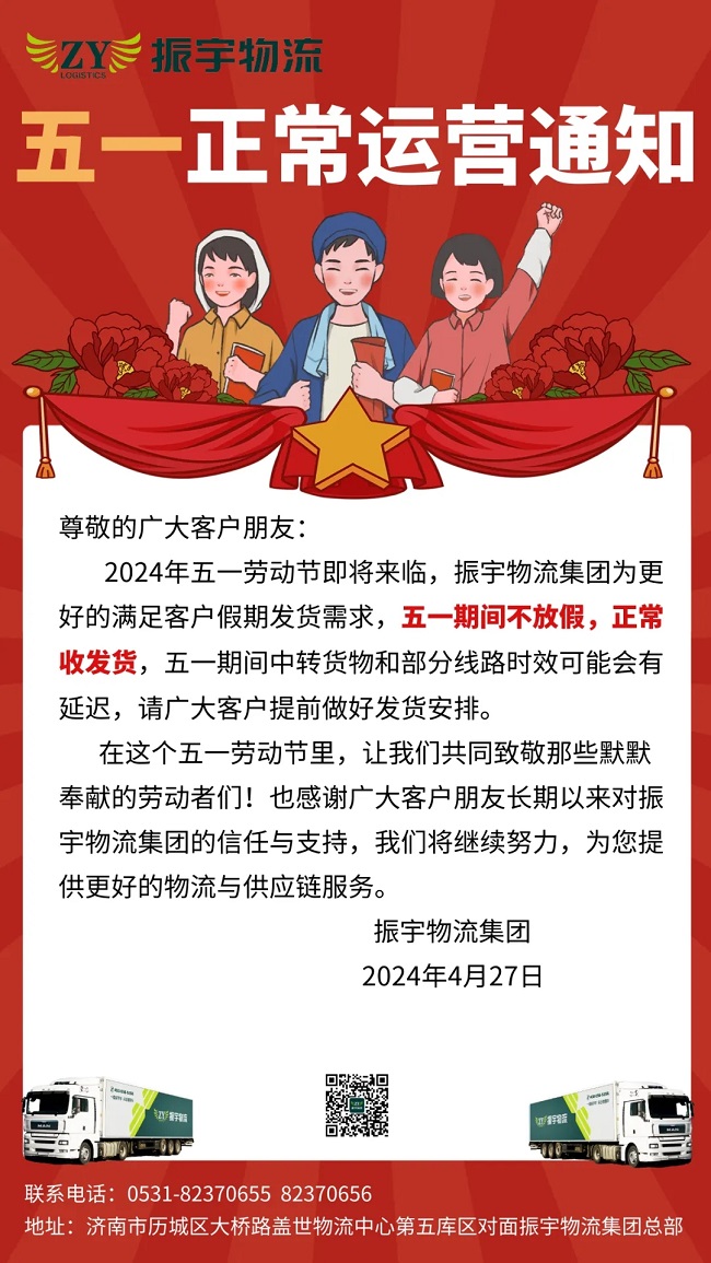 2024年五一勞動(dòng)節(jié)即將來臨,振宇物流集團(tuán)為更好的滿足客戶假期發(fā)貨需求,五一期間不放假,正常收發(fā)貨,五一期間中轉(zhuǎn)貨物和部分線路時(shí)效可能會(huì)有延遲,請廣大客戶提前做好發(fā)貨安排。