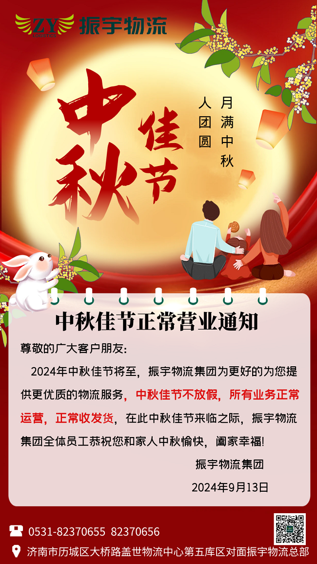 2024年中秋佳節(jié)將至,振宇物流集團為更好的為您提供更優(yōu)質的物流服務,中秋佳節(jié)不放假,所有業(yè)務正常運營,正常收發(fā)貨,在此中秋佳節(jié)來臨之際,振宇物流集團全體員工恭祝您和家人中秋愉快,闔家幸福!
