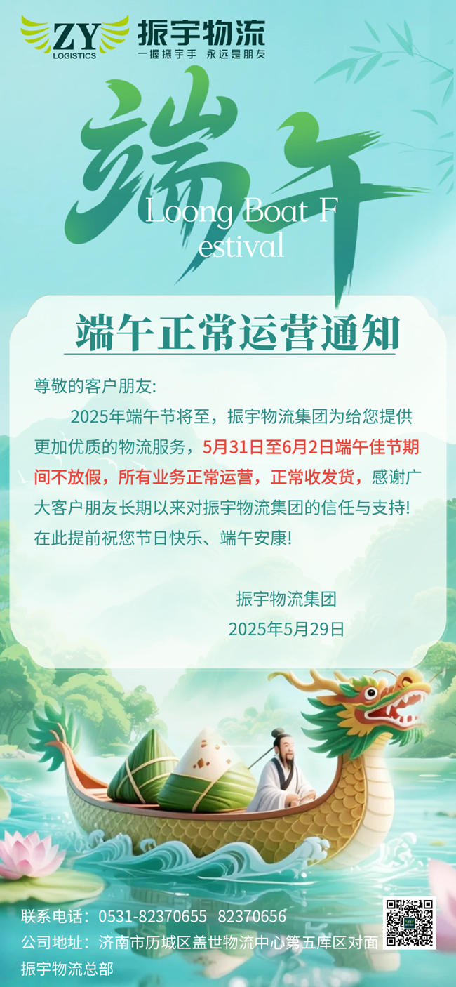 2025年端午節(jié)將至,振宇物流集團為給您提供更加優(yōu)質(zhì)的物流服務(wù),5月31日至6月2日端午佳節(jié)期間不放假,所有業(yè)務(wù)正常運營,正常收發(fā)貨,感謝廣大客戶朋友長期以來對振宇物流集團的信任與支持!在此提前祝您節(jié)日快樂、端午安康!