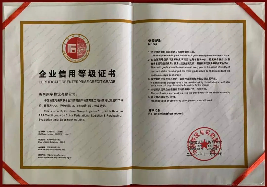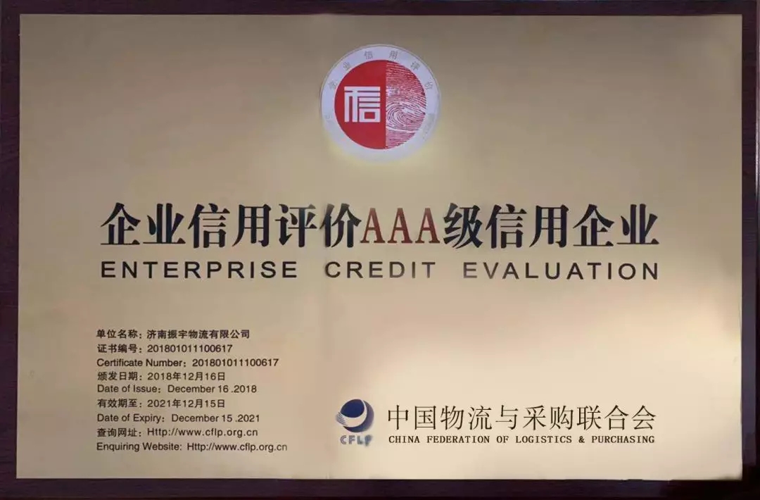 濟(jì)南振宇物流有限公司:國家3A級(jí)信用企業(yè)