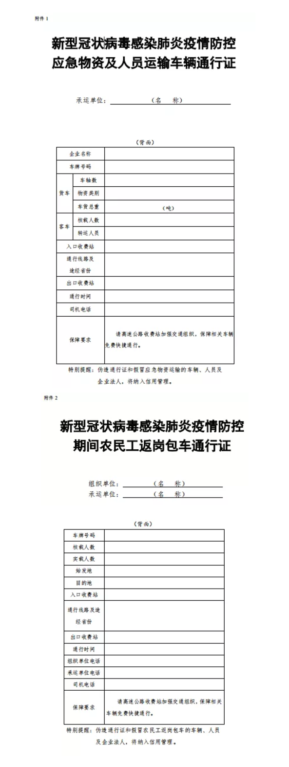 通知要求,地方各級(jí)交通運(yùn)輸部門要認(rèn)真落實(shí)《交通運(yùn)輸部關(guān)于切實(shí)保障疫情防控應(yīng)急物資運(yùn)輸車輛順暢通行的緊急通知》和《交通運(yùn)輸部關(guān)于疫情防控期間免收農(nóng)民工返崗包車公路通行費(fèi)的通知》要求,切實(shí)簡(jiǎn)化“新型冠狀病毒感染肺炎疫情防控應(yīng)急物資及人員運(yùn)輸車輛通行證”(簡(jiǎn)稱“車輛通行證”)、“新型冠狀病毒感染肺炎疫情防控期間農(nóng)民工返崗包車通行證”(簡(jiǎn)稱“包車通行證”)辦理流程,通過政府網(wǎng)站、微信、電子郵件等便捷方式提供“車輛通行證”“包車通行證”統(tǒng)一式樣,供承運(yùn)單位或駕駛?cè)嗽诒镜刈孕写蛴 ⒆孕刑顚憽?/span>