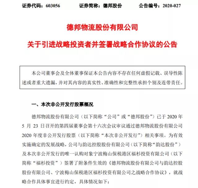 5月24日晚間披露非公開發(fā)行預(yù)案,擬募集資金總額不超過6.14億元,用于轉(zhuǎn)運中心智能設(shè)備升級項目和IT信息化系統(tǒng)建設(shè)項目。本次非公開發(fā)行的發(fā)行價格為9.20元/股,發(fā)行對象為福杉投資。本次非公開發(fā)行完成后,福杉投資預(yù)計持有公司總股本比例約為6.5%,福杉投資依托于韻達(dá)股份的相關(guān)戰(zhàn)略資源,與德邦股份具體開展戰(zhàn)略合作。