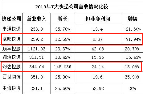 而根據(jù)德邦股份發(fā)布了2019年業(yè)績報告,2019年實現(xiàn)營業(yè)收入259.22億元,同比增長12.58%;實現(xiàn)歸屬上市公司股東凈利潤3.24億元,同比下滑53.82%??鄯莾衾麧櫹陆?91.94%。在虧損的邊緣徘徊。