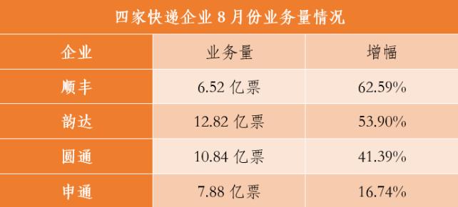 9月18日晚間,順豐控股、圓通速遞、韻達股份和申通快遞四家企業(yè)發(fā)布8月經(jīng)營簡報。數(shù)據(jù)顯示,四家快遞企業(yè)繼續(xù)保持高速增長。其中,順豐業(yè)務(wù)量增幅繼續(xù)領(lǐng)跑,韻達連續(xù)五個月、圓通連續(xù)四個月單月業(yè)務(wù)量破10億票。