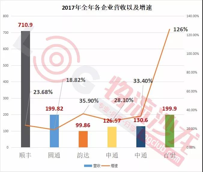 我們可以從營收增速來看看各家企業(yè)表現(xiàn)力。具體來看,百世第一,增幅高達126%,其次是韻達、中通、申通,分別是35.9%、33.4%、28.1%,都高于郵政局公布的2017年全年快遞收入增長速度(2017年行業(yè)增速為24.7%)。
