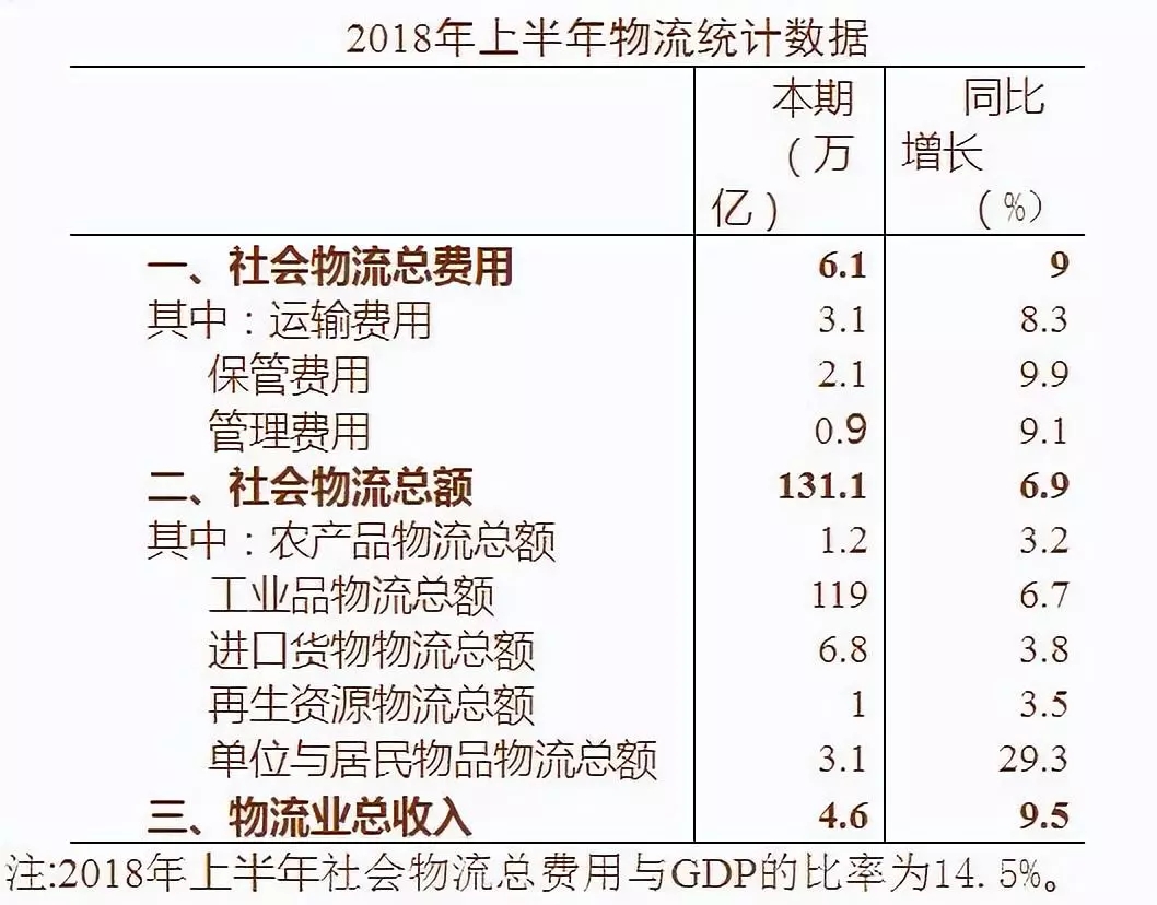 2018年1-6月,社會(huì)物流總費(fèi)用為6.1萬億元,同比增長9%,增速比一季度提高2個(gè)百分點(diǎn);物流市場規(guī)模穩(wěn)步增長,物流業(yè)總收入為4.6萬億元,同比增長9.5%,增速比一季度提高1.3個(gè)百分點(diǎn)。