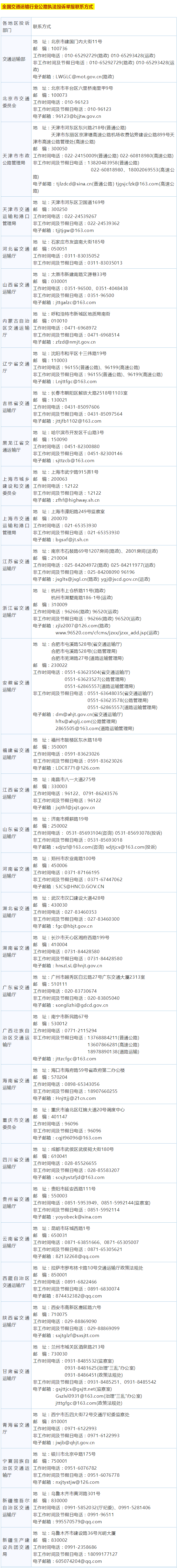 交通運(yùn)輸部公路局、道路運(yùn)輸司聯(lián)合向社會(huì)集中公布全國(guó)交通運(yùn)輸行業(yè)公路執(zhí)法行風(fēng)投訴舉報(bào)電話(huà)、通信地址和電子郵箱地址。