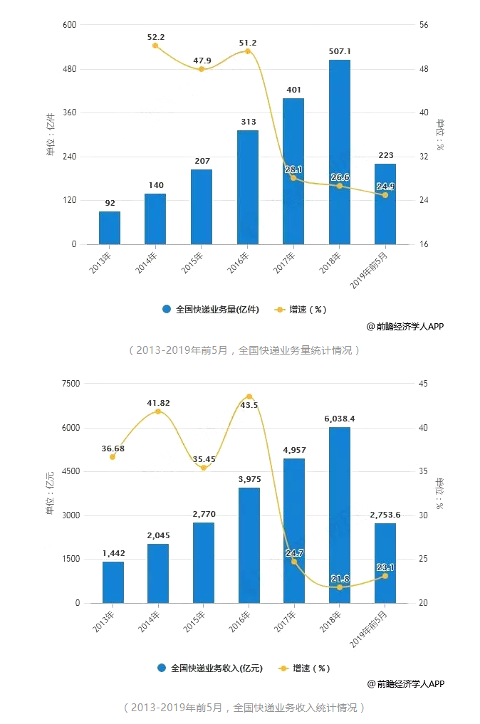 進(jìn)入2019年5月,全國快遞服務(wù)企業(yè)業(yè)務(wù)量為52.3億件,同比增長25.2%;業(yè)務(wù)收入達(dá)618.1億元,同比增長24.2%。累計方面,2019年1-5月,全國快遞服務(wù)企業(yè)業(yè)務(wù)量累計達(dá)到223億件,同比增長24.9%;業(yè)務(wù)收入累計達(dá)到2753.6億元,同比增長23.1%。