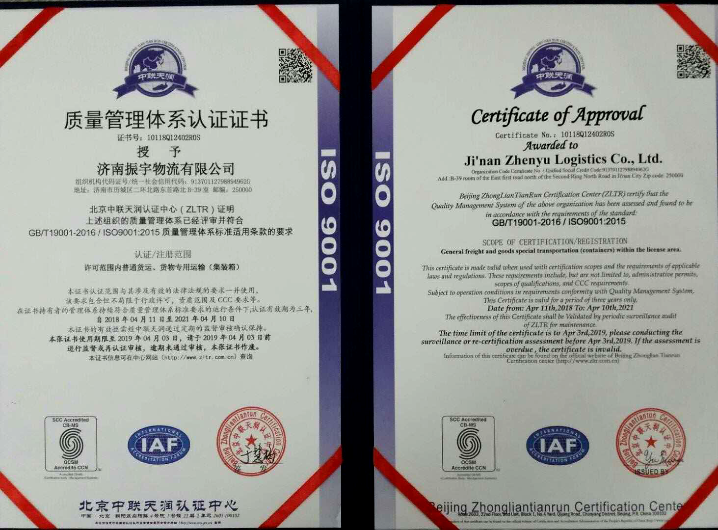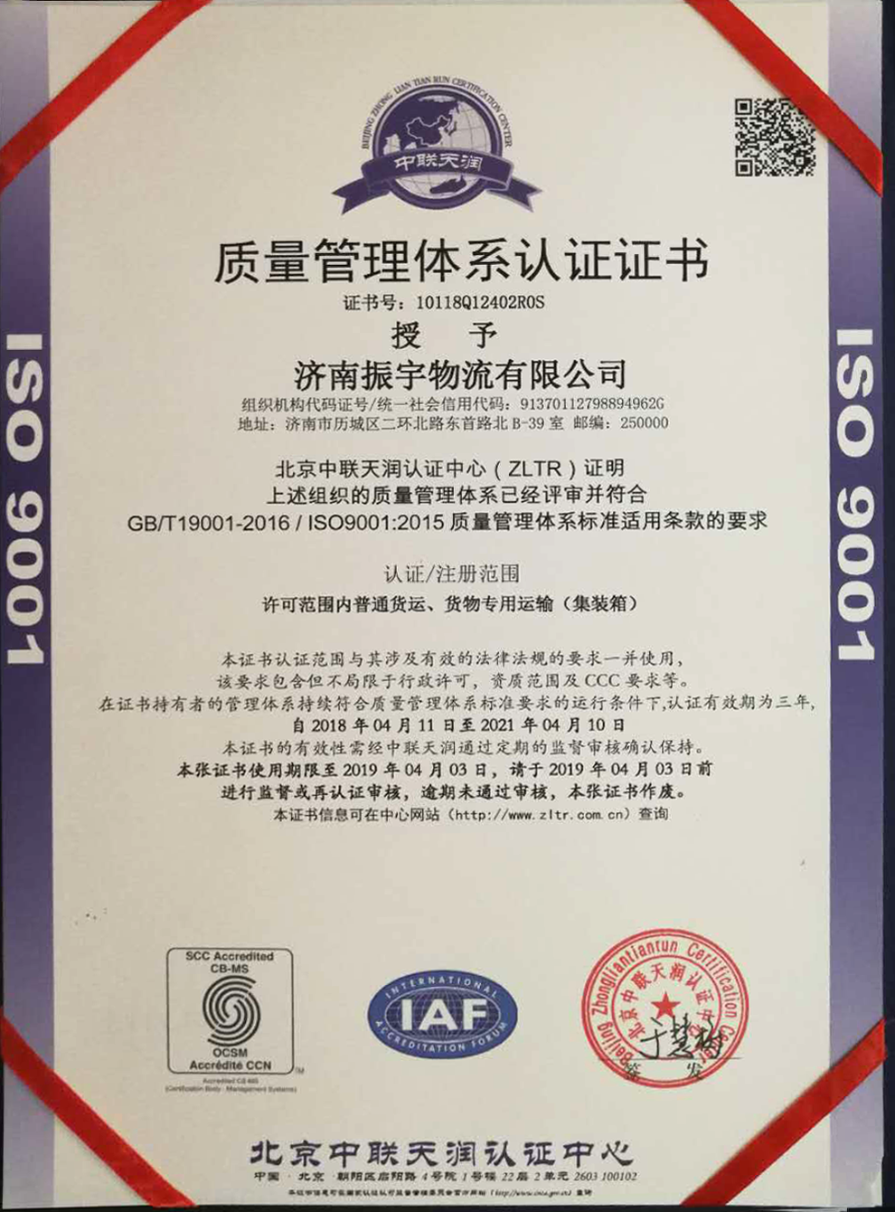 ISO 9001質量管理體系認證證書